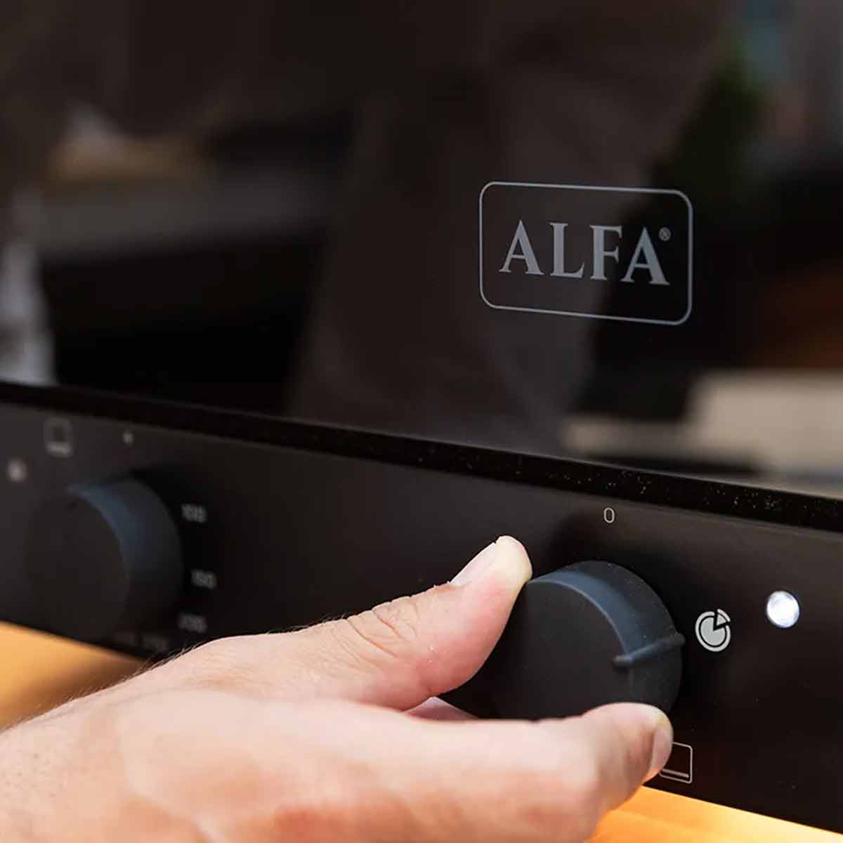 Der Ofen ist sofort einsatzbereit: Einfach die Alfa-Steinplatte in die Backkammer legen, den Stecker anschließen und einschalten. Dank seiner kompakten Bauweise passt er so gut wie auf jede flache Oberfläche, einschließlich einer Standard-Küchenarbeitsplatte mit 60 cm Tiefe.Geräumiger Innenraum für perfekte Pizzen