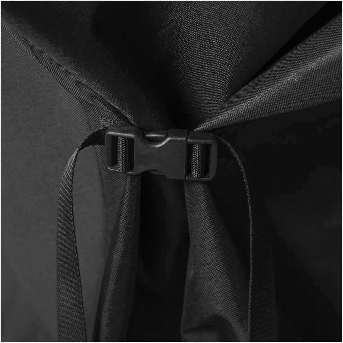 Die seitlichen Cinch-Riemen mit Kunststoffclips sorgen dafür, dass die Haube zuverlässig an ihrem Platz bleibt. Selbst wenn es draußen richtig stürmisch wird, sitzt sie fest und sicher. Einfach anlegen, festziehen und guten Gewissens stehenlassen.