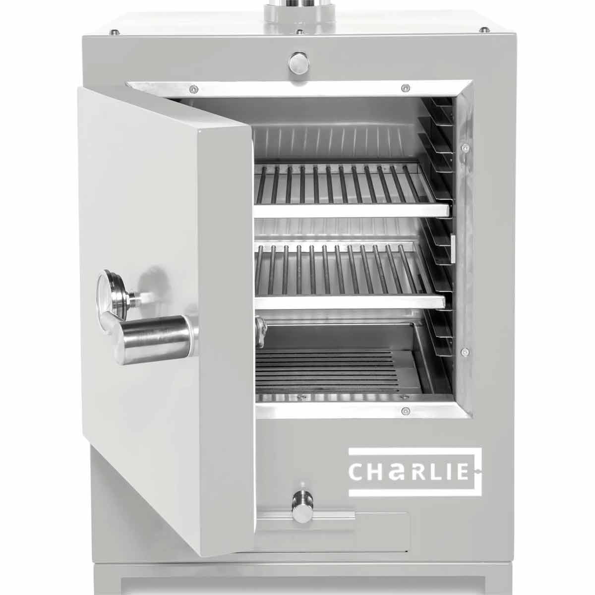 Der Cheeky Charlie wurde speziell für Outdoor-Küchen mit begrenztem Platz entwickelt, ohne Kompromisse bei Leistung oder Stil einzugehen. Sein kompakter Korpus bietet Platz für sechs höhenverstellbare Grillroste, sodass Ihr gleichzeitig grillen, backen, schmoren und smoken könnt – alles in einem Gerät.