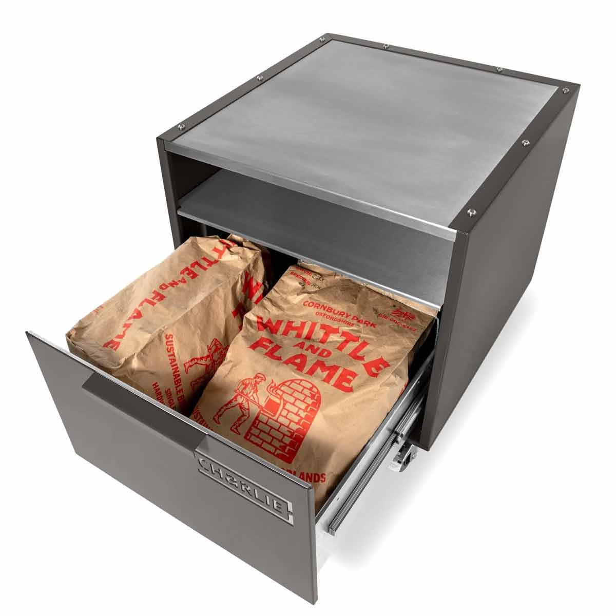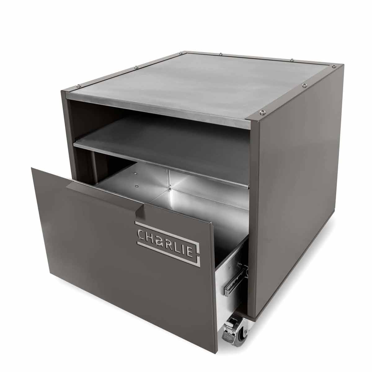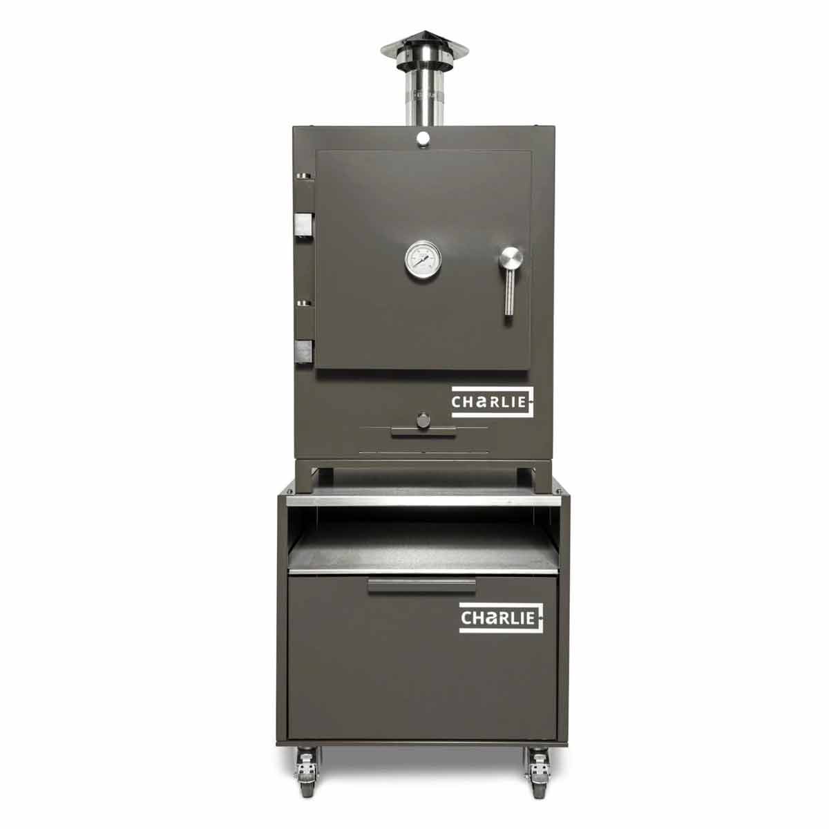 Langlebig, massiv, zuverlässig: Der Unterwagen setzt – typisch Charlie – auf eine hochwertige Edelstahlkonstruktion. Die Edelstahl-Arbeitsfläche trägt Euren Ofen sicher und absolut stabil, während die tiefe Edelstahl-Ablage darunter zusätzlichen Platz für Zubehör und Tools bietet.