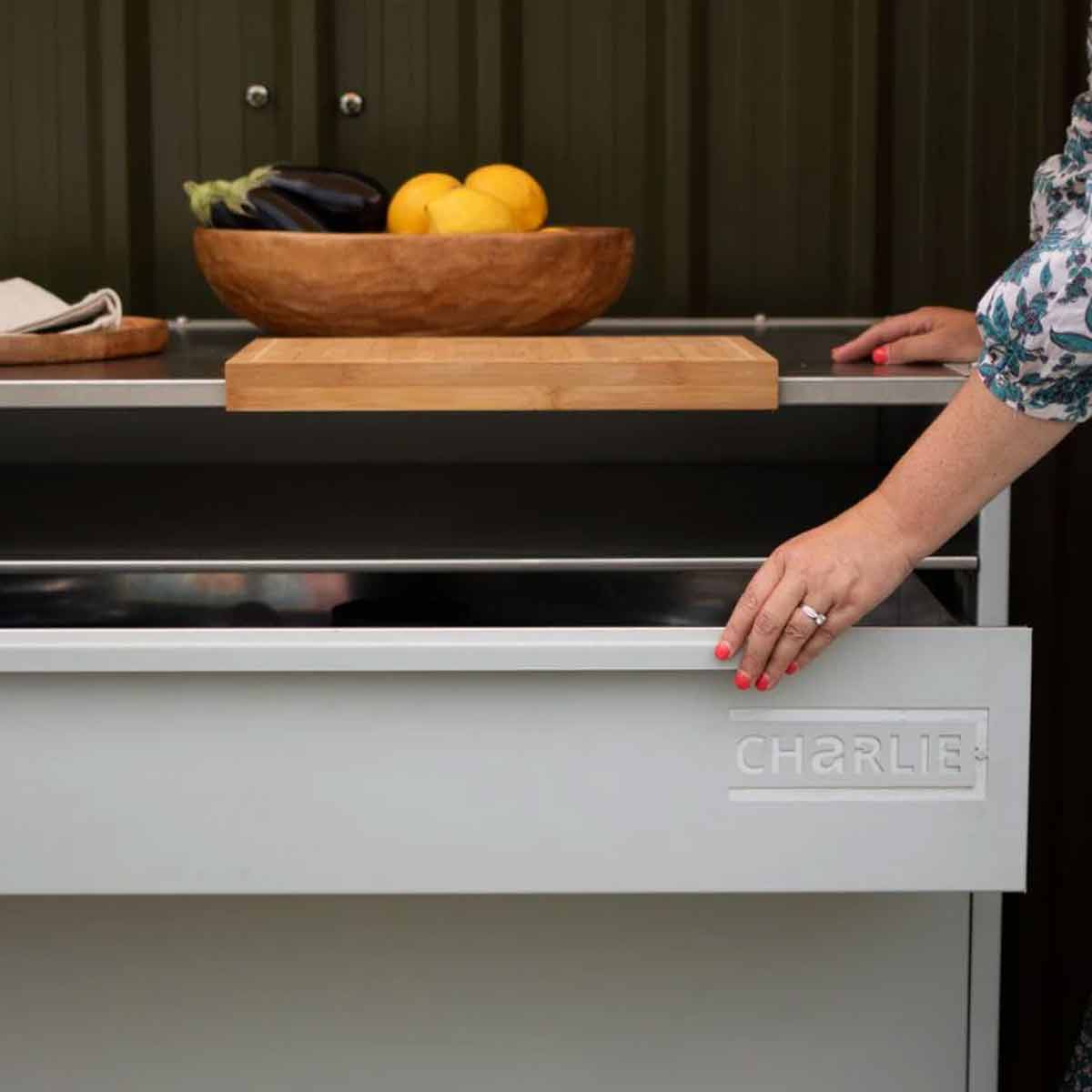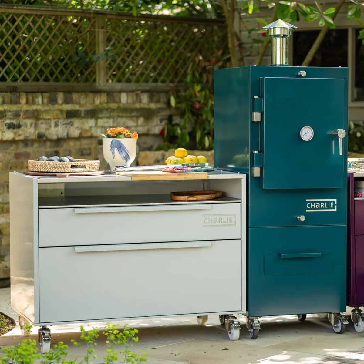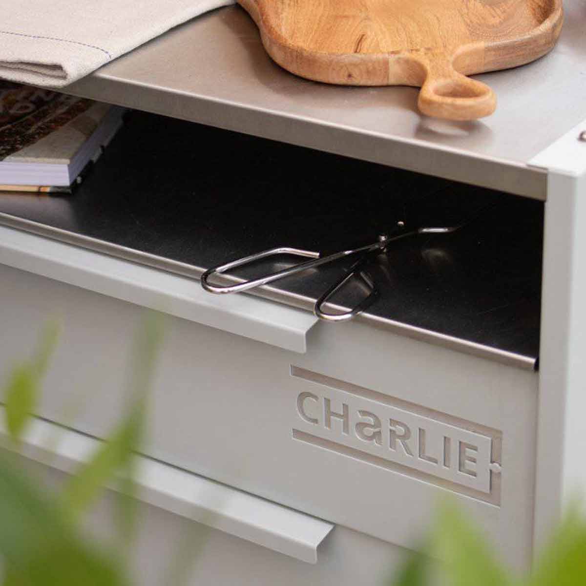 Der Beistellwagen ist Teil der modularen Charlie Outdoor-Küchen-Serie und lässt sich ideal mit den Charlie Öfen und Unterschränken kombinieren.