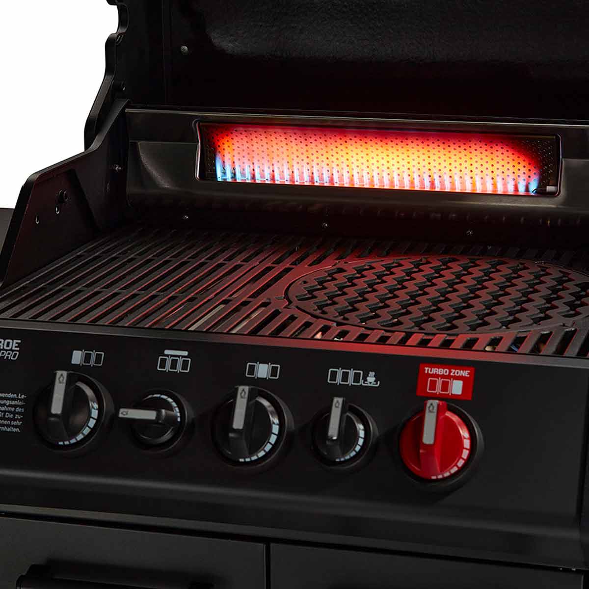 Außerdem könnt Ihr auf der 800°C Turbo Zone Eurem Grillgut mit ordentlich Röstaromen Feuer machen. Hier sorgt ein frei regulierbarer 4,2 kW-Brenner für Extra-Power, das spezielle Mesh-Gewebe der Brennerabdeckung heizt zusätzlich mit Infrarot-Hitze ein. Wer auf Spießgerichte und krosse Pizza steht, wird sich über die zusätzliche Heckbrenner-Power freuen, die mit 3,5 kW für krosse Grillergebnisse sorgt. Und da auch Beilagen beim BBQ-Menü eine wichtige Rolle spielen, rundet ein Seitenkochfeld die Ausstattung perfekt ab.