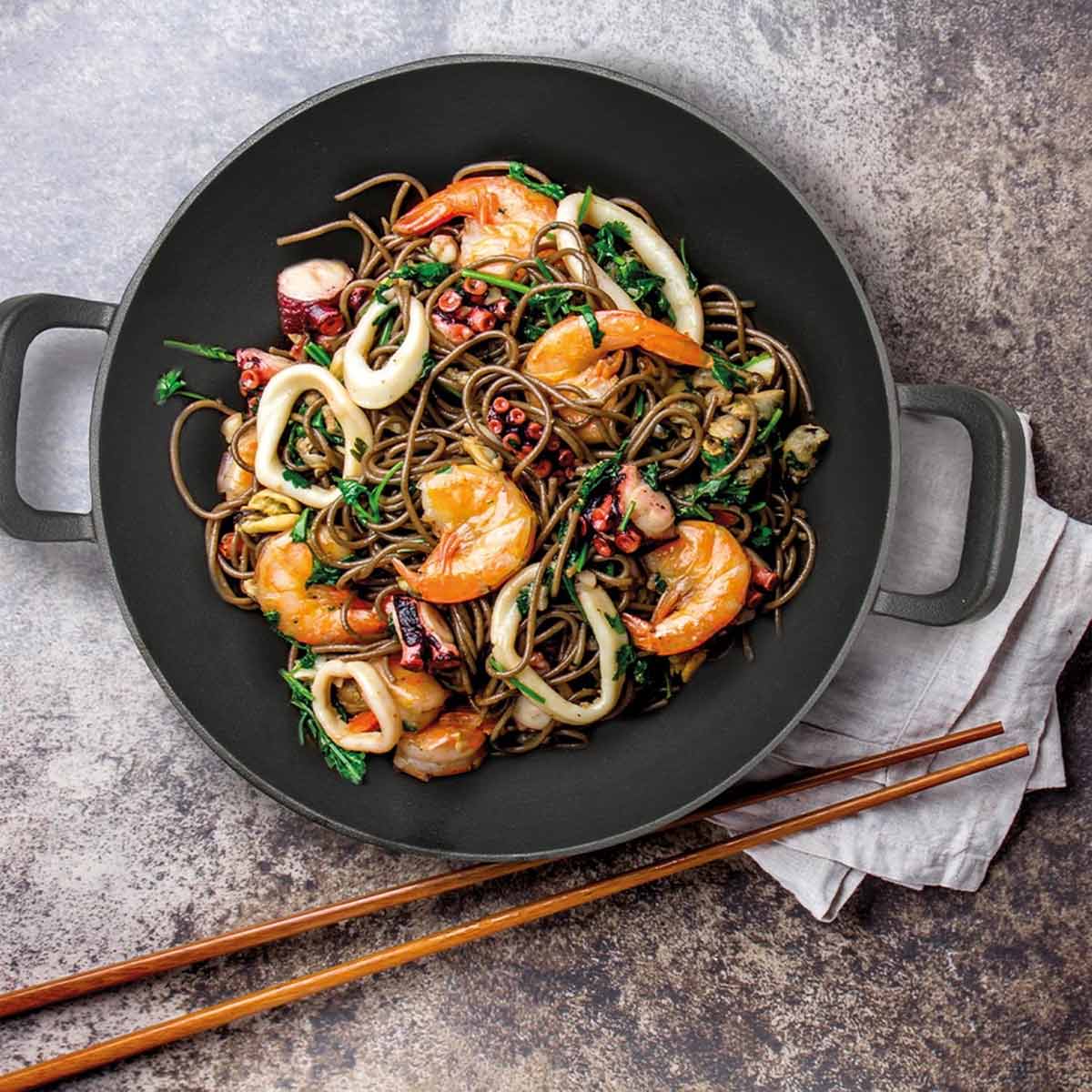 Durch die zweiseitigen Stilgriffe wird das schwenken der Zutaten ganz leicht, wodurch es zu einer idealen Verteilung der Zutaten kommt.