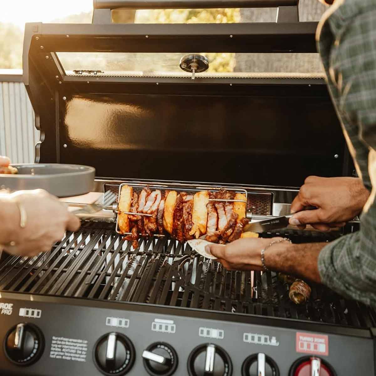 Der Edelstahlspieß mit Fleischklammern und Kontergewicht sorgt für sicheren Halt und beste Stabilität, selbst bei schwerem Grillgut.