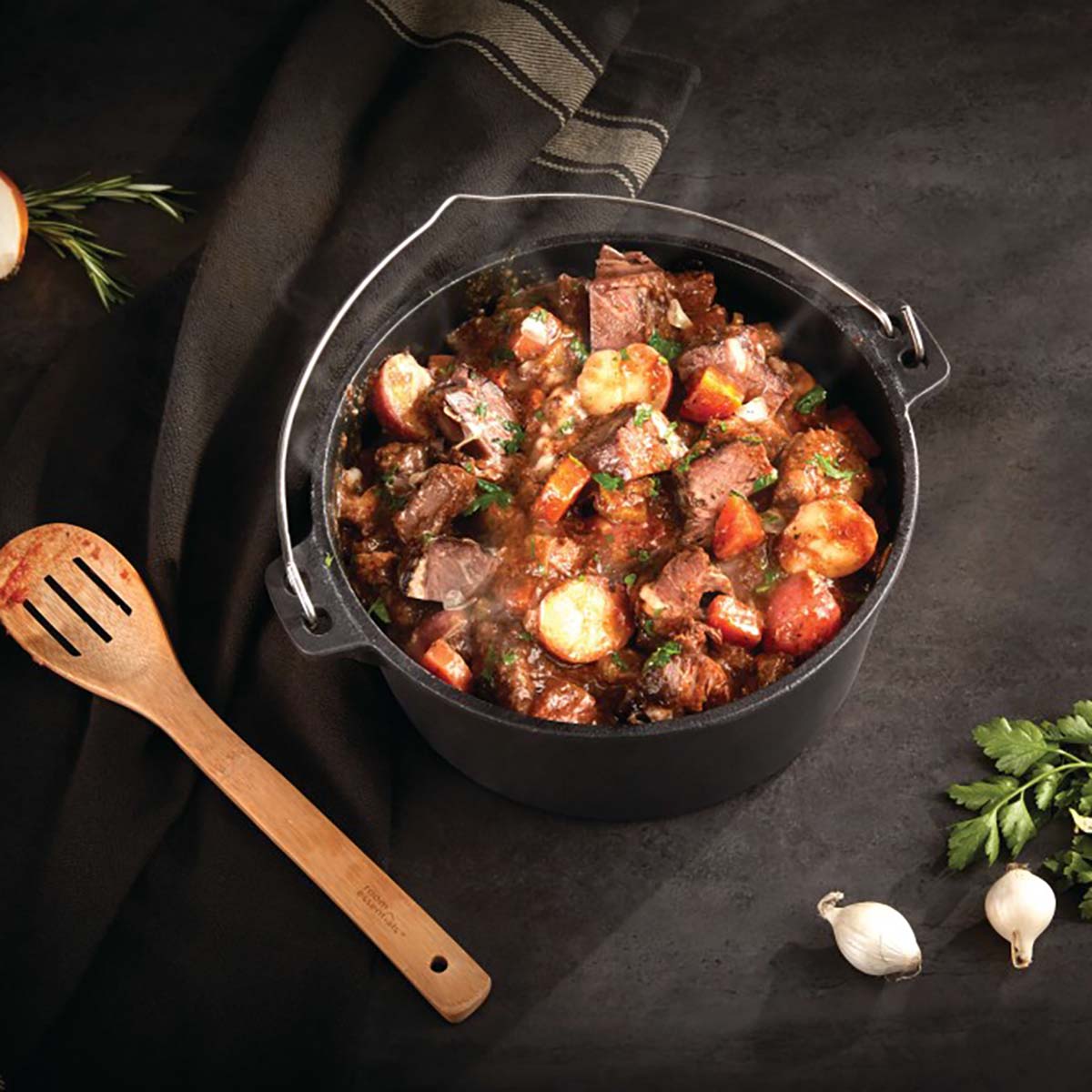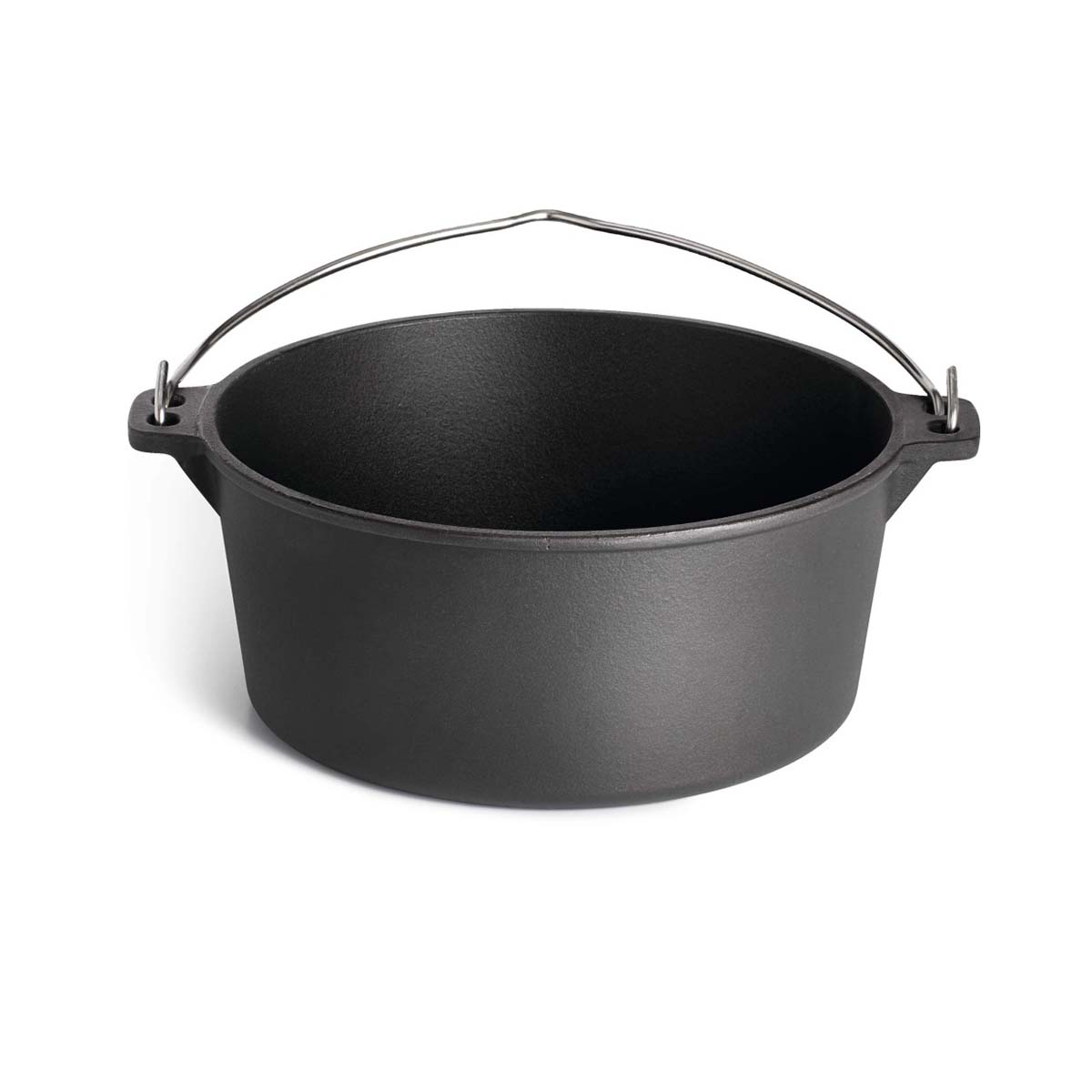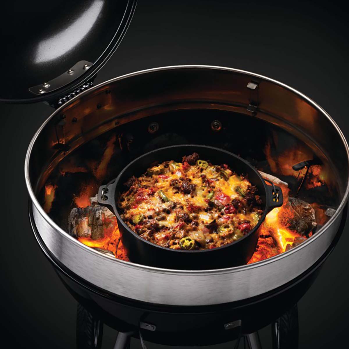 Langsames Garen und Schmoren in großen Mengen ist der perfekte Einsatzbereich für den massiven Gusstopf. Er funktioniert überall und kommt auf oder im Ofen, auf dem Grill und den Seitenbrennern, über oder direkt in Holzkohle und sogar direkt in der Feuerstelle zum Einsatz.