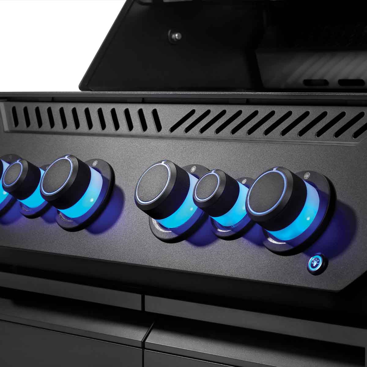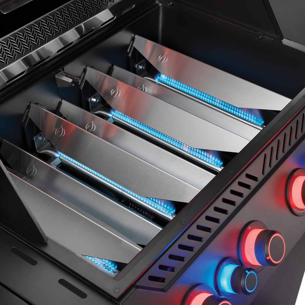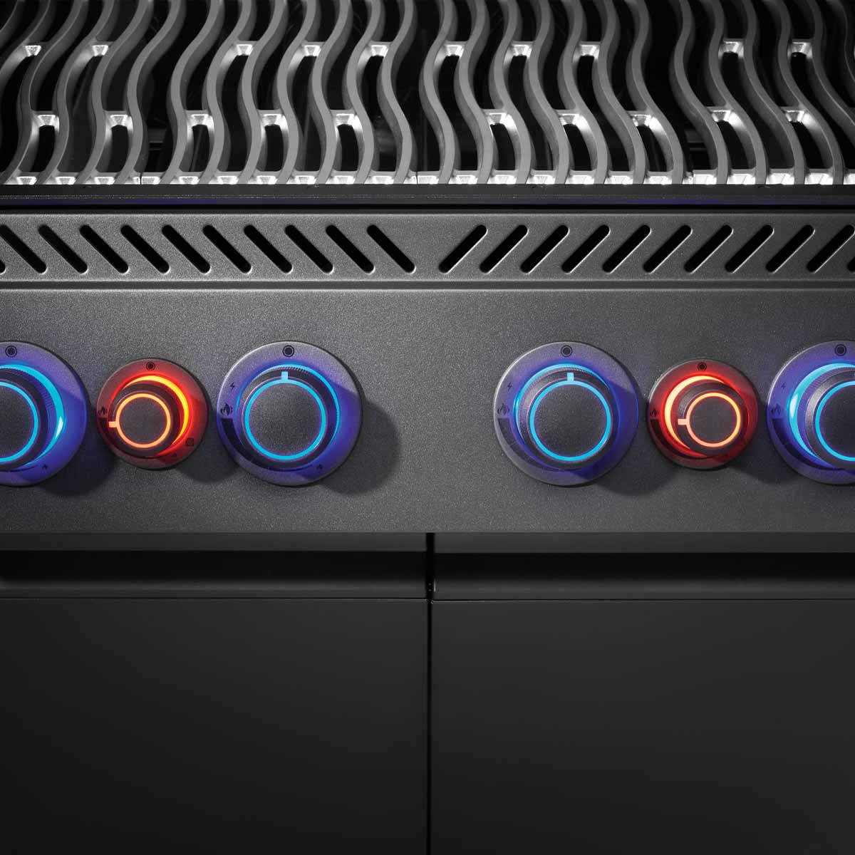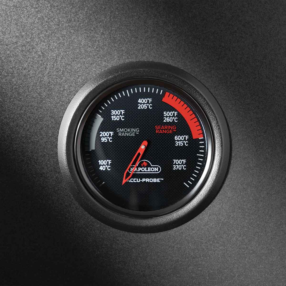 Das punktgenaue ACCU PROBE Thermometer von Napoleon ist im Deckel eingelassen und zeigt die Innenraumtemperatur des Gasgrills absolut zuverlässig an. Die ergonomischen SAFETY GLOW Drehregler liegen angenehm in der Hand und sorgen für eine präzise Steuerung der Temperatur. Die Bedienelemente sind mit einer Hintergrundbeleuchtung ausgestattet, sodass man auch im Dunklen den Überblick behält. Die Beleuchtung ändert sich bei Gasfluss von blau zu rot, so dass Ihr mit einem Blick erkennen könnt, welche Brenner gezündet sind. Für den Napoleon Phantom P500 haben auch das Thermometer und die Drehregler ein mattschwarzes Finish erhalten.