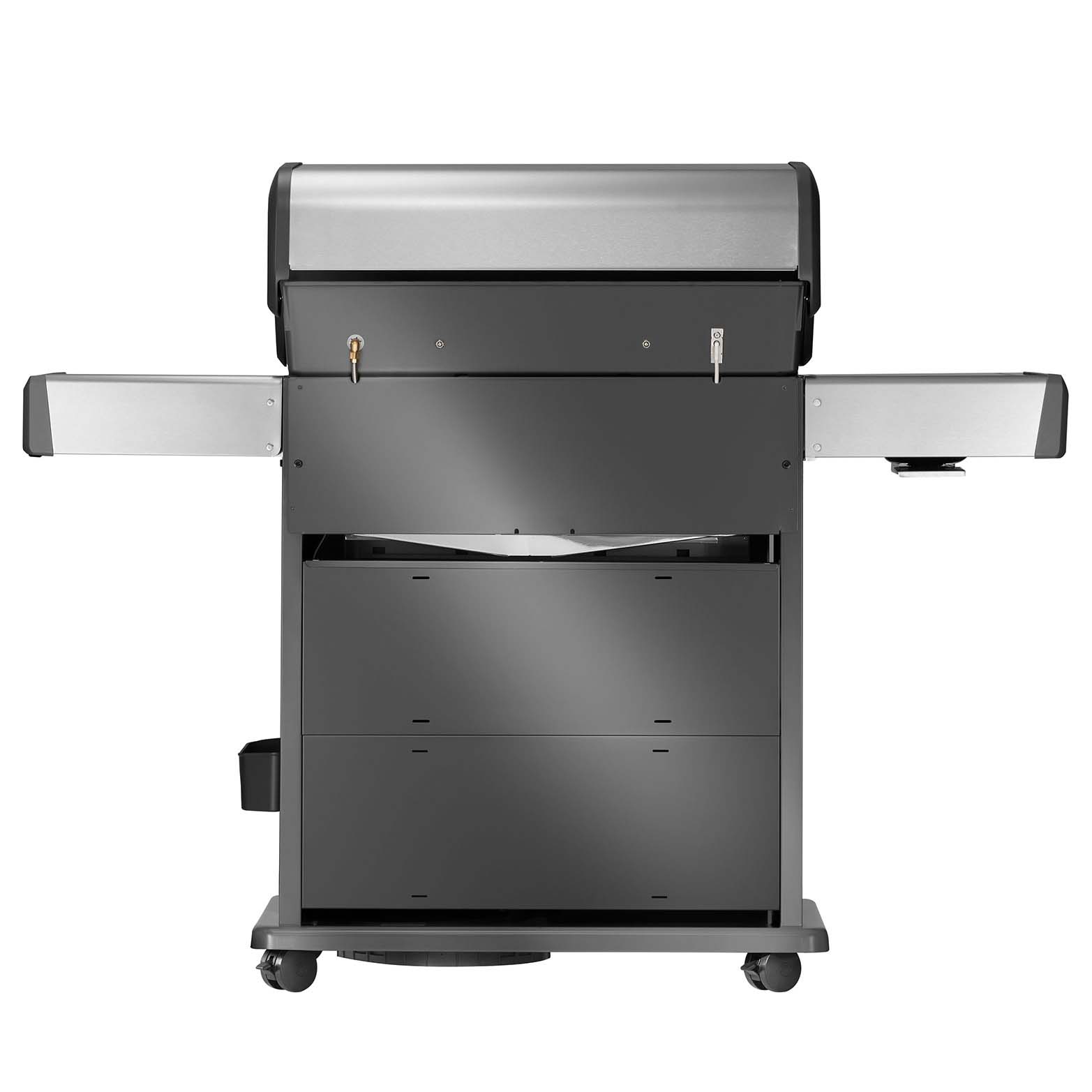 Der Napoleon Rogue PRO-S 525 verfügt über zwei große Seitenablagen, auf denen Grillzubehör, Geschirr und Gewürze ihren Platz finden. Die rechte Seitenablage lässt sich bei Bedarf herunterklappen, was den Grill kompakt und platzsparend macht. Im Unterschrank befindet sich eine Gasflaschenhalterung für Flaschen bis 11 kg. Die stabilen Lenkrollen sorgen dafür, dass der Grill einfach verschoben und flexibel eingesetzt werden kann.