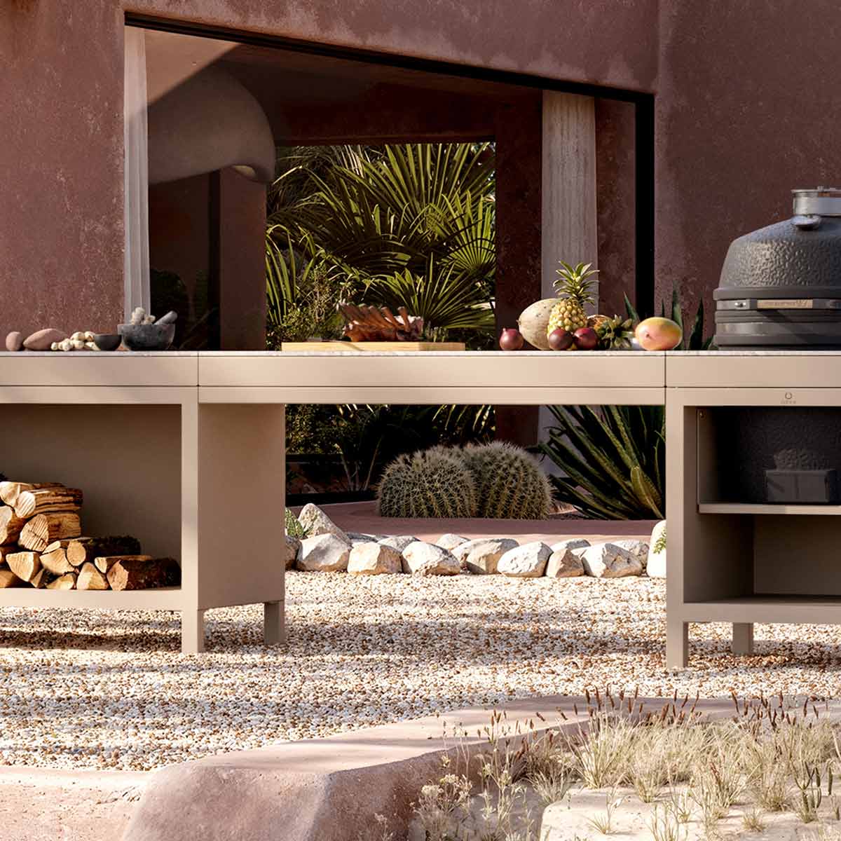 Die Basis besteht aus pulverbeschichtetem Aluminium, das robust und wetterfest ist. Die Arbeitsfläche aus Dekton überzeugt durch ihre Hitzebeständigkeit, Kratzfestigkeit und leichte Reinigung. Für jeden Stil passend, ist die Ofyr Pro Connect in zwei eleganten Farbkombinationen erhältlich: Taupe mit heller Sand-Dektonplatte oder Schwarz mit schwarzer Asche-Dektonplatte.