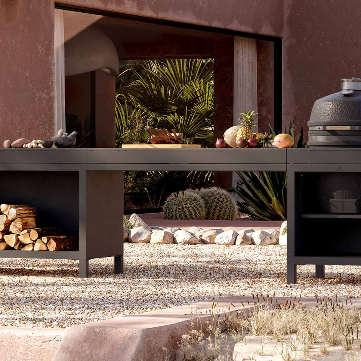Die Kombination aus robustem Aluminium, Edelstahl und der hitzebeständigen Dekton-Arbeitsfläche sorgt für Langlebigkeit und unkomplizierte Pflege – perfekt für den ganzjährigen Einsatz im Freien.