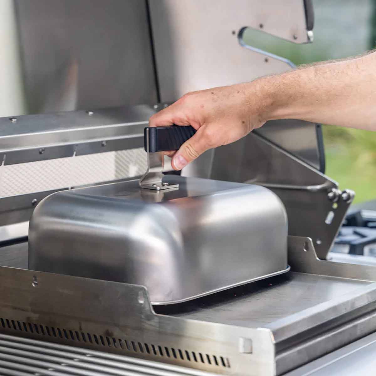 Unsere Plancha-Haube für den G32 ist aus hochwertigem Edelstahl mit Griff aus hitzebeständigem Nylon gefertigt.