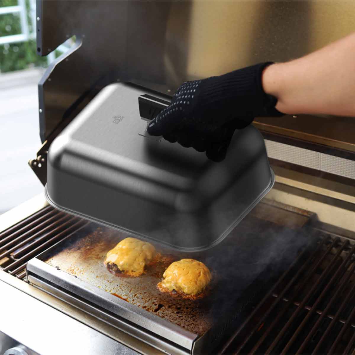 Unsere Plancha-Haube sorgt dafür, dass Wärme auch von oben an Ihr Grillgut gelangt und lässt so zum Beispiel den Käse auf Ihrem Cheeseburger gleichmäßig und zügig schmelzen.