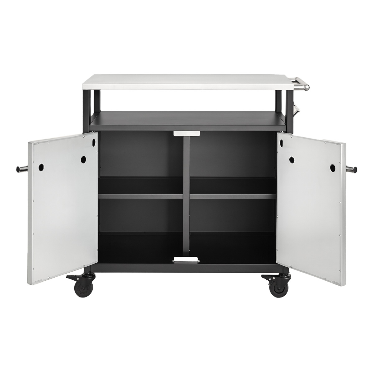 Die großzügige Edelstahl-Arbeitsfläche bietet Euch reichlich Platz zum Vorbereiten, Anrichten und Ablegen von Zutaten und Zubehör. Unterhalb der Fläche befindet sich ein offenes Fach – ideal für Kräuter, Grillzangen oder Marinaden. Hinter den beiden Türen verstecken sich zwei Regalböden, so dass Ihr auch innen Euer Equipment ordentlich lagern könnt.