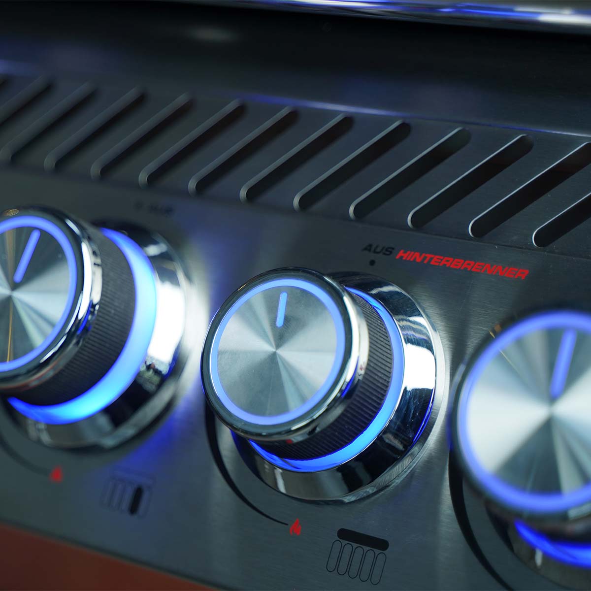 Wichtig: Sobald die Beleuchtung über den Lichtknopf angeschaltet wurde, leuchten die Gasregler in der „AUS“-Stellung in Blau und in der „AN“- Stellung in Rot. Anhand der Beleuchtung lässt sich jedoch nicht erkennen, ob der Gasfluss ein- oder ausgeschaltet ist. Auch eine entzündetet Flamme wird darüber nicht kontrolliert. Das solltet Ihr jeweils als Benutzer prüfen.