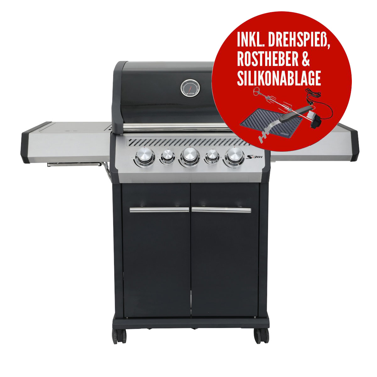 SANTOS S-318 mit Seiten- & Heckbrenner | Schwarz inkl. Drehspieß | Rostheber & Silikonablage