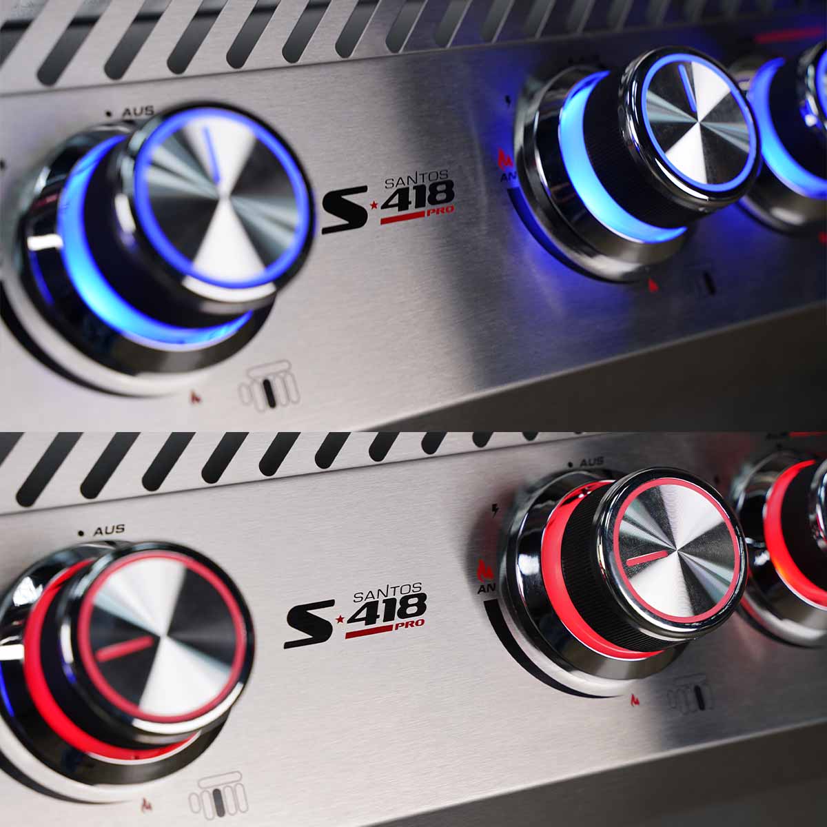 Die in den Farben Blau und Rot beleuchteten Bedienelemente setzen Euren S-418 Pro gekonnt in Szene und ermöglichen Euch auch in der Dämmerung und bei Dunkelheit eine präzise Steuerung der Grilltemperatur. Sie sehen nicht nur stylisch aus, sondern zeigen auch an, welcher Brenner gerade mit Gas versorgt wird. Blau bedeutet, dass bei dem entsprechenden Brenner kein Gasfluss vorhanden und der Brenner aus ist. Rot bedeutet, dass die Gaszufuhr geöffnet ist. Hinweis: Bei roter Beleuchtung solltet Ihr zusätzlich überprüfen, ob dieser Brenner auch gezündet ist.