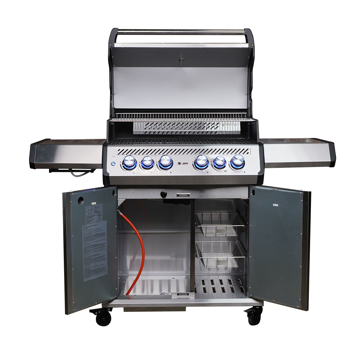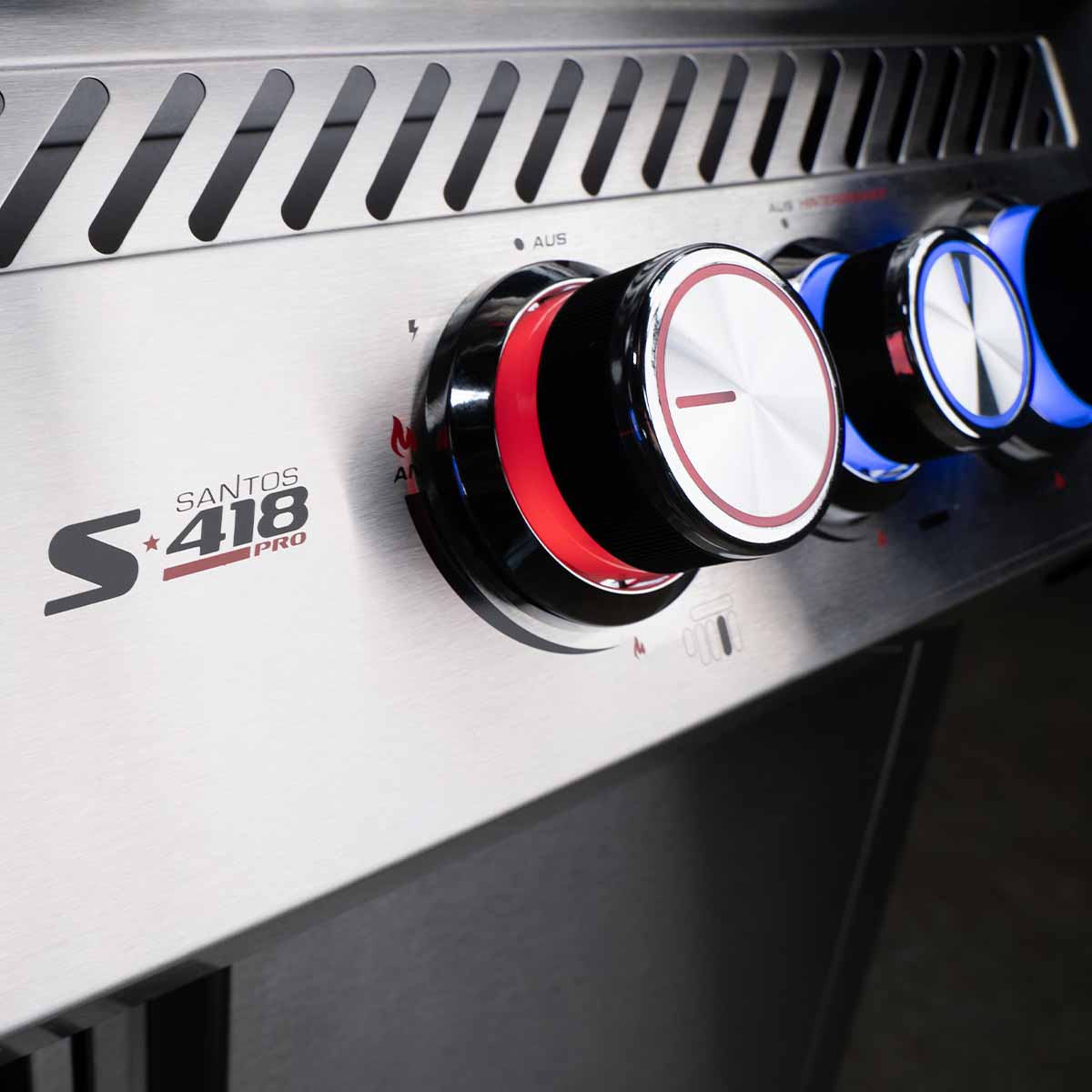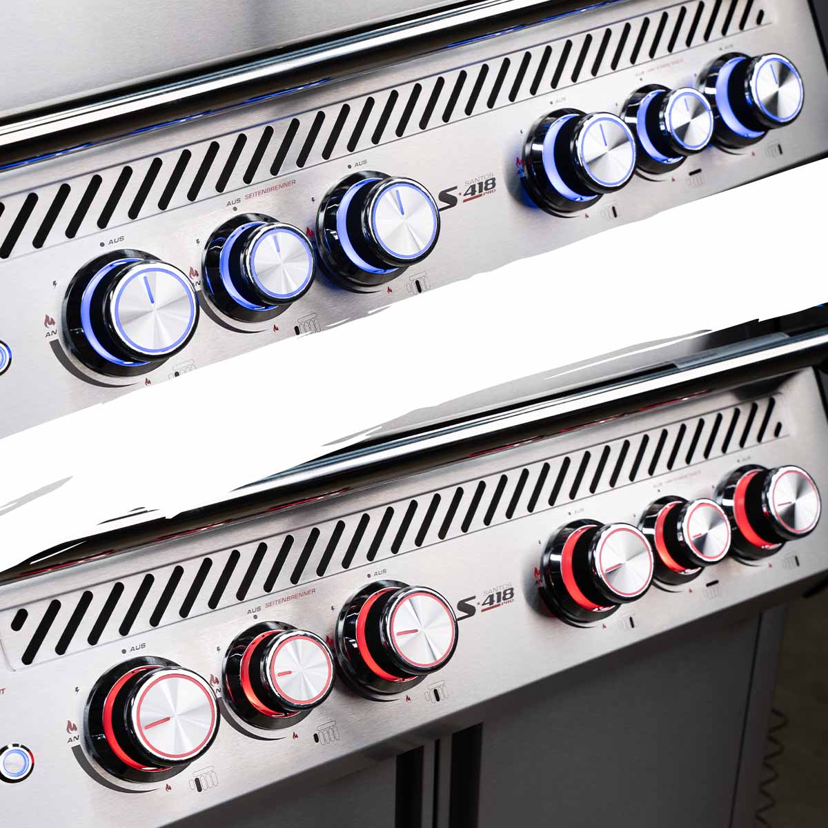 Die in den Farben Blau und Rot beleuchteten Bedienelemente setzen Euren S-418 Pro gekonnt in Szene und ermöglichen Euch auch in der Dämmerung und bei Dunkelheit eine präzise Steuerung der Grilltemperatur. Sie sehen nicht nur stylisch aus, sondern zeigen auch an, welcher Brenner gerade mit Gas versorgt wird. Blau bedeutet, dass bei dem entsprechenden Brenner kein Gasfluss vorhanden und der Brenner aus ist. Rot bedeutet, dass die Gaszufuhr geöffnet ist. Hinweis: Bei roter Beleuchtung solltet Ihr zusätzlich überprüfen, ob dieser Brenner auch gezündet ist.