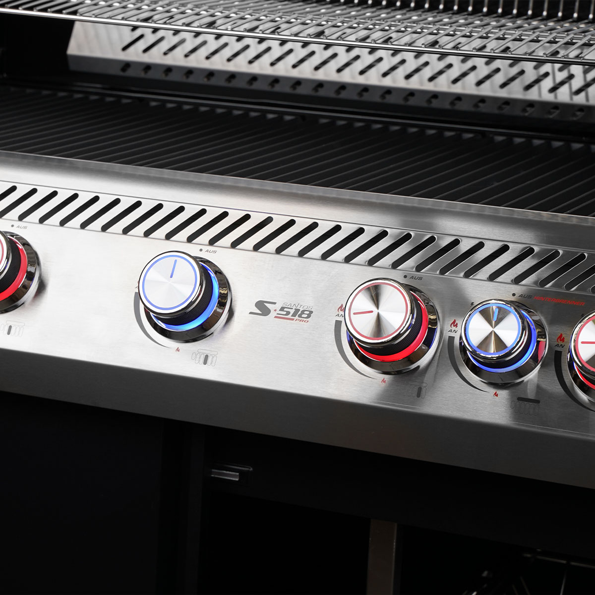Die in den Farben Blau und Rot beleuchteten Bedienelemente setzen Euren S-518 Pro gekonnt in Szene und ermöglichen Euch auch in der Dämmerung und bei Dunkelheit eine präzise Steuerung der Grilltemperatur. Sie sehen nicht nur stylisch aus, sondern zeigen auch an, welcher Brenner gerade mit Gas versorgt wird. Blau bedeutet, dass bei dem entsprechenden Brenner kein Gasfluss vorhanden und der Brenner aus ist. Rot bedeutet, dass die Gaszufuhr geöffnet ist. Hinweis: Bei roter Beleuchtung solltet Ihr zusätzlich überprüfen, ob dieser Brenner auch gezündet ist.