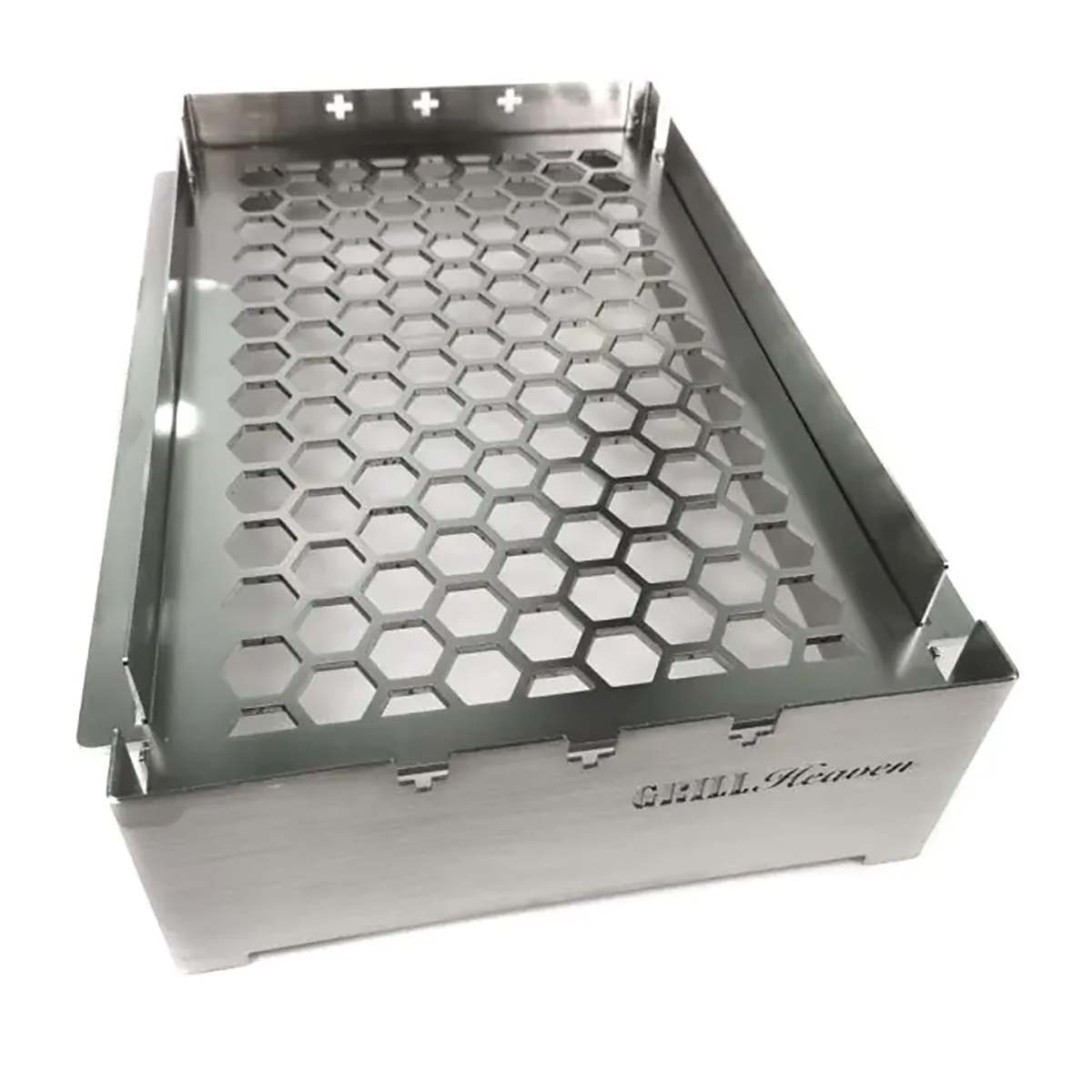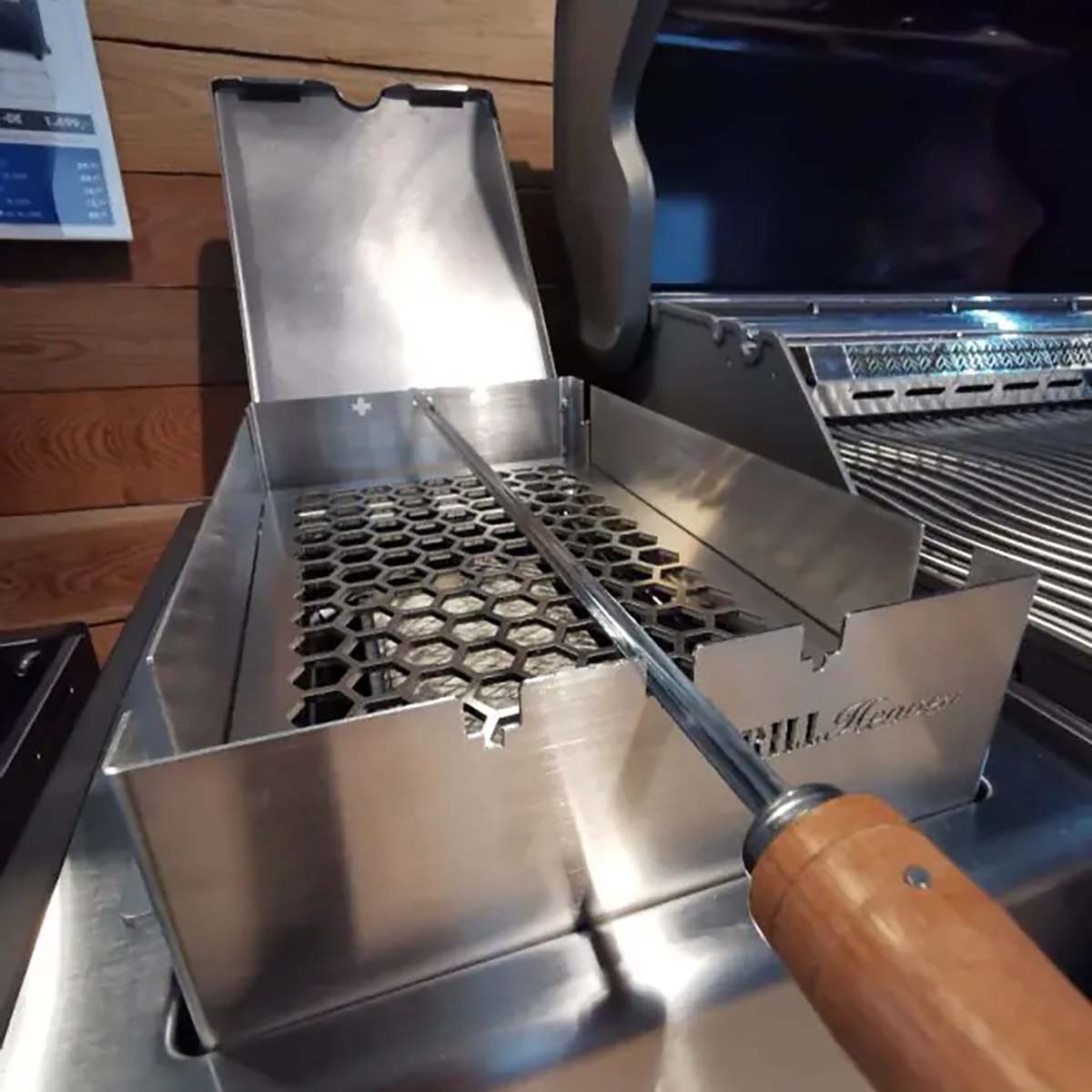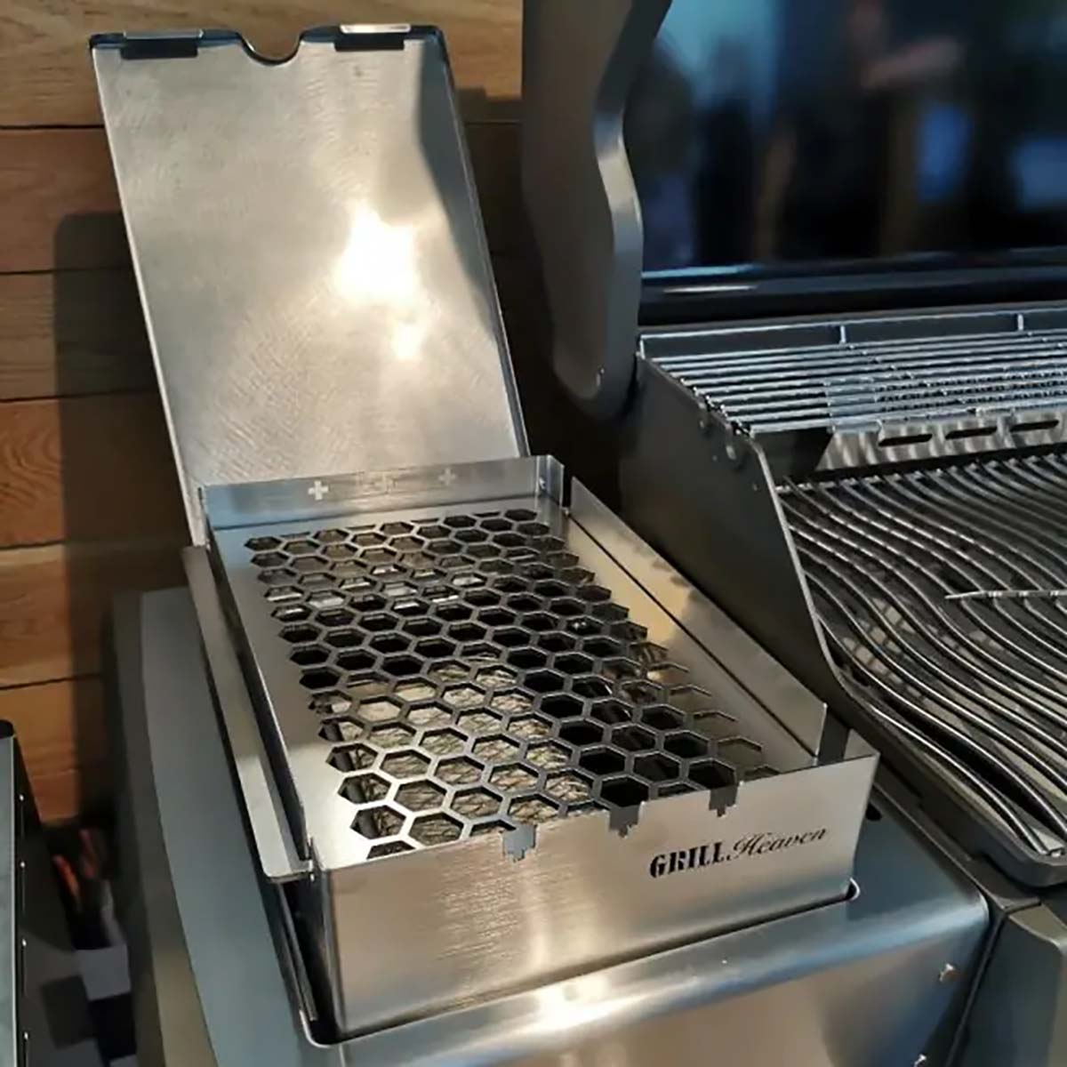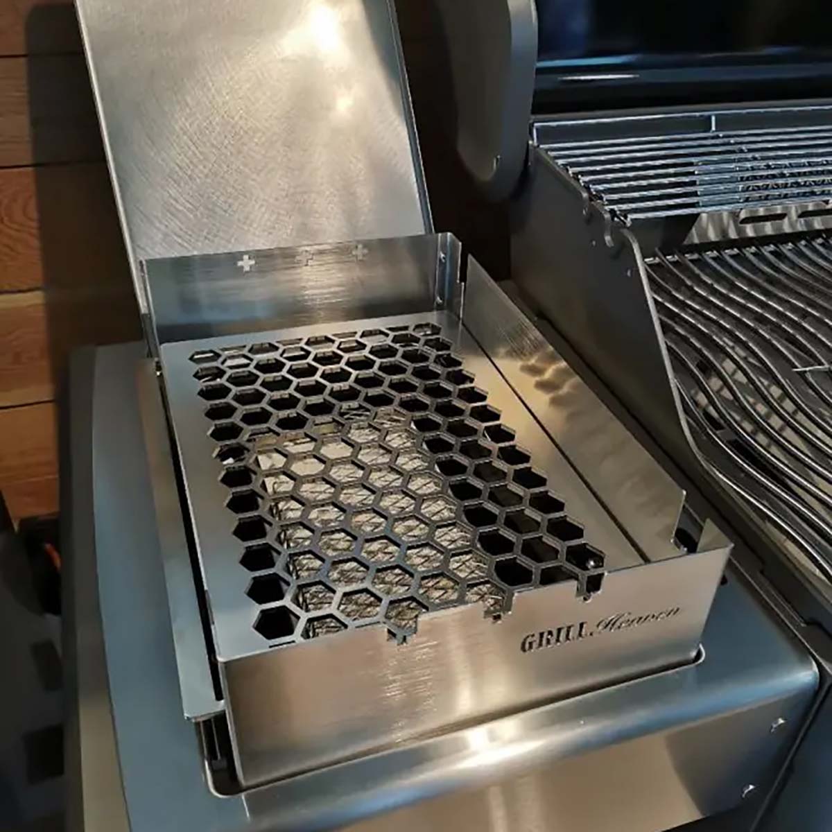 Wir haben den Wusch vieler Napoelon Rogue SE & Prestige Besitzer erfüllt und einen Edelstahlrost in Wabenoptik für die Sizzle Zone herausgebracht! Um auch feinere Fleischsorten wie Hühnerfleisch oder Fisch auf der Sizzle Zone zubereiten zu können, haben wir den Edelstahlost (4 mm) höherverstellbar (2 Stufen) gemacht und gleichzeitig in unserem genialen Windschutz integriert. Dieser hat nach wie vor drei Halterungen für die Grillspieße.